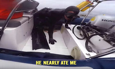 Johan Potgieter a une fait rencontre très proche avec grand requin blanc au large des côtes de l' Afrique du Sud. On peut le voir se retrouver face à face avec un requin blanc qui le surprend et lui dégager avec son harp...