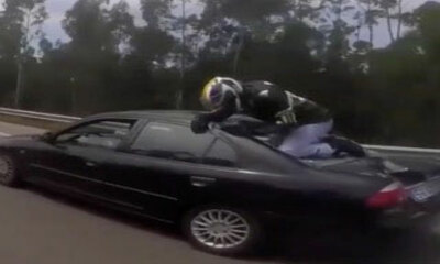 Accident spectaculaire sur l’autoroute A28, près de Vila do Conde au Portugal. Un motard vient percuter l’arrière d’une voiture pour se retrouver sur le toit de cette dernière. Les images ont été filmées avec la caméra e...