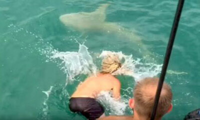 En Australie, un groupe de pêcheurs qui avait réussi à capter un requin ont voulu tenter de le ramener à la main. C’est alors qu’un des hommes sautent dans l’eau pour attraper le requin et tenter de le rapprocher le plus...