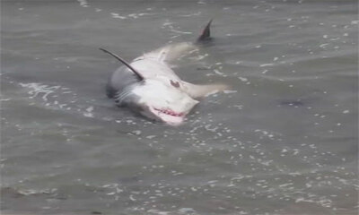 Ce grand requin blanc pris dans les vagues peu profondes au large de Pleasure Point de Santa Cruz, est mort pendant la nuit. A la marée basse, la fondation California Fish and Wildlife a pu effectué une nécropsie pour co...