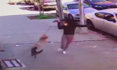 Aux États-Unis, une femme avec son chien en laisse entre dans un immeuble, mais se retrouvée face à face avec un chat agressif. Ce dernier sauté sur le chien et la maitresse paniquée essaye d'esquiver les attaquent du ch...