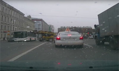 Sur une route à Saint-Pétersbourg, en Russie, un ouvrier perd le contrôle de son bobcat. Sur ces images, on peut voir la mini-chargeuse se mettre à rebondir frénétiquement en levant son godet avant de percuter une voitur...
