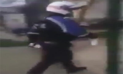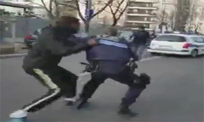 En France, un policier à moto intervient avec une gazeuse pour disperser un jeune virulent qui veut absolument en découdre avec lui. Ce dernier ne va pas hésiter à lui sauter dessus pour l'agresser en lui donnant un coup...