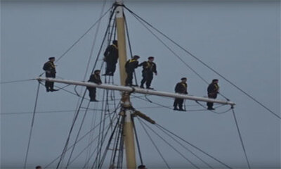 Le Statsraad Lehmkuhl, un trois-mâts barque norvégien qui après avoir navigué pendant 3 mois dans l'océan Atlantique rentre au port. Tous les marins se sont perchés sur les mâts du voilier et chantent une chanson traditi...