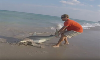 Aux Etats-Unis, un homme sauve un requin à pointe noir coincé dans une ligne de pêche. On peut le voir apercevoir le requin et se mettre à courir dans sa direction pour venir l'extirper de ce piège qui pourrait le blesse...