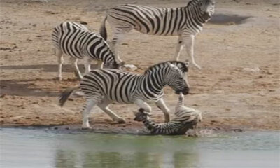 Alors qu'un troupeau de zèbres s'abreuve dans un point d'eau du parc national d'Etosha, en Namibie, un mâle dominant essaie de tuer un zébreau. Pour cela, il lui maintient la tête sous l'eau, et ce devant la maman zébrel...