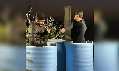 Dans un jeu qui consiste à frapper d'autres personnes au moment où ils sortent d'un bidon, un homme profite du fait d'avoir perdu son masque et d'avoir un avantage certain sur ses concurrents…
