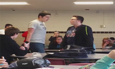 Dans un restaurant scolaire aux États-Unis, deux élèves comment par s'embrouiller quand l'un des deux commencent par frapper l'autre. Il lui donne trois coup de poing dans la mâchoire qui auraient mis la plupart d'entre ...
