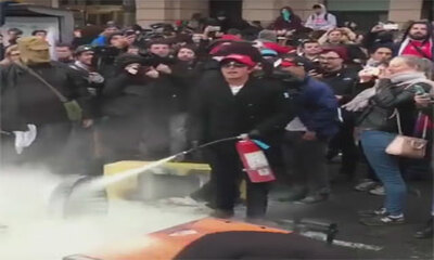Lors de l'investiture de Donald Trump, des anti-trump ont décidé de jouer les trouble-fête en incendiant des voitures, des poubelles et autres mobiliers urbains. C'est alors qu'un fan de Trump a voulu calmer les choses e...