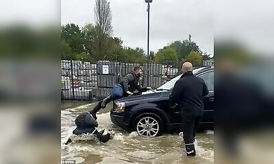 Durant les inondations provoquées par la tempête Babet, une scène choquante s'est déroulée sur Nottingham Road à Ilkeston, Derbyshire. Un homme, essayant d'empêcher les voitures de créer des vagues augmentant le niveau d...