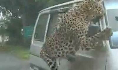 Un conducteur indien a capturé une vidéo de l'instant où un léopard a bondi sur un fourgon en train de rouler dans un village, avant de poursuivre sa route vers des habitations. Plusieurs touristes et des gardes forestie...