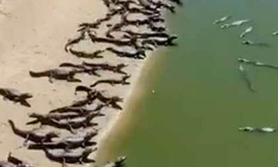 Une vidéo insolite ou pendant ce temps-là, on se rend au brésil pour découvrir une plage très ou pas accueillante. Sur ces images insolites, nous pouvons voir des centaines de crocodiles allongés sur les deux rivage et p...