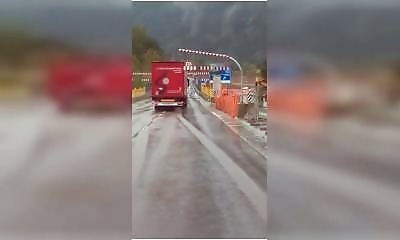 Un chauffeur poids lourd tente de passer sous une structure malgré les barres de hauteur installées pour prévenir. La première barre est déjà heurtée, preuve que le camion est trop haut. Normalement, on s’arrête, mais lu...