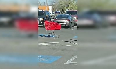 Un homme attend tranquillement dans sa voiture pendant que sa compagne fait les courses. Il regarde autour de lui, téléphone en main, sans intention de bouger. Il croise brièvement le regard d’un chariot de supermarché a...