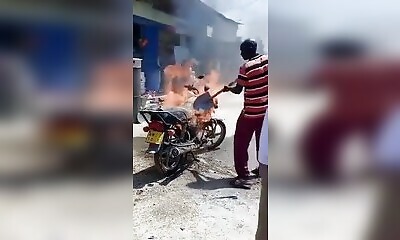 Un homme s’approche d’une moto en feu. Il ne tente pas d’éteindre les flammes, il choisit plutôt d’ouvrir le réservoir. Pour ça, il utilise un outil en métal, un genre de pelle. Il insiste, il force. Le feu continue de b...