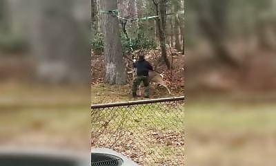 Vivre en pleine forêt réserve parfois des surprises inattendues, comme ce cerf qui s'est fait piéger par des cordes dans un jardin. Ses bois se sont complètement enchevêtrés dans les fils tendus entre les arbres. Impossi...