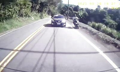 Un motard fait l'erreur de vouloir doubler par la droite et finit sa route par un petit envol