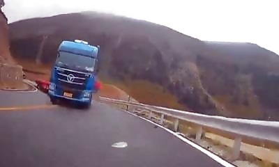En Chine, un motocycliste croise un camion dont le chargement tombe sur la route. Il semble que le motard est encore en vie ou non blessé grâce à de sacrés réflexes !