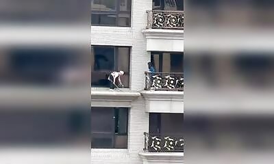 J'ai encore peu d'information sur cette vidéo, mais elle n'en reste pas moins saisissante: À plusieurs dizaines de mètres de hauteur, une femme de ménage nettoie la corniche d'un appartement, sous le regard d'une autre f...