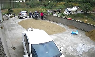 En Chine, deux camions toupies basculent dans l'eau au même endroit en l'espace de quelques minutes seulement. La caméra de surveillance d'une maison filme la première bétonnière qui se renverse dans un fossé sur une rou...