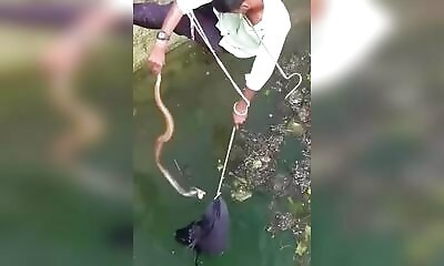 Dans cette vidéo, un homme intrépide tente de sauver un serpent dans un puits profond. À l'aide d'une corde, il descend courageusement et utilise un crochet pour attraper la queue du serpent et le mettre dans un sac. Le ...