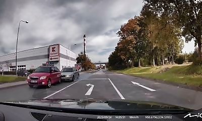 La voiture grise arrive peut être un peu vite (difficile à dire), mais la rouge lui coupe clairement la route en mode balec !