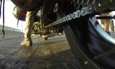 Passer de 0 à 339 km/h à l'heure en 7 secondes met la chaîne à rude épreuve. Ça décoiffe ! Aux États-Unis, une caméra embarquée est placée à l’arrière d’une Drag Bike (Motorcycle drag racing) et plus exactement à la haut...