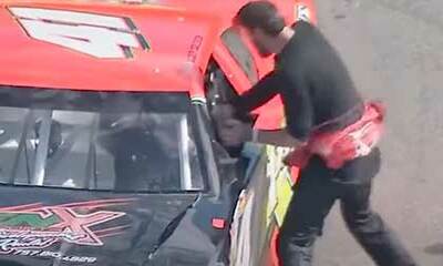 Pourquoi ? Pour une queue de poisson ! Lors de la course Nascar au championnat régionaux en Virginie, aux États-Unis, le pilote Andrew Grady a décidé d’attendre son concurrent Davey Callihan pour lui demander des explica...
