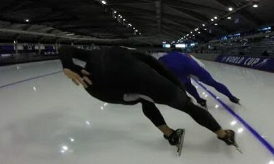 Des images sportives qui nous montrent l'Américain KC Boutiette placé derrière ses compatriotes Kimani Griffin et Joey Mantia. Cette vidéo nous plonge en plein 400 mètres de patinage de vitesse filmé en POV sur la patino...