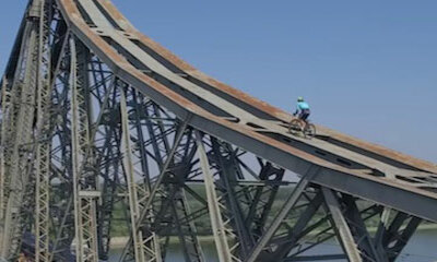 Sur son vélo de route, le cycliste italien Vittorio Brumotti, spécialiste du trial et membre du team Astana, joue les équilibristes au bord d’un pont en Roumanie. Un exercice périlleux qu'il maîtrise à la perfection à 20...