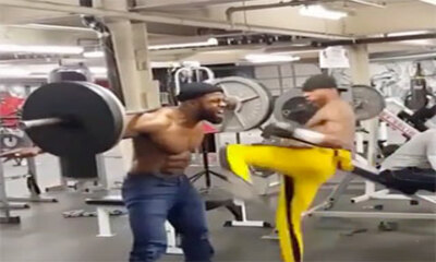 Dans une salle de sport aux États-Unis, un homme fait des squats à barre tout en contractant ses abdominaux afin de recevoir des coups de pied dans le ventre. Bon, une technique à ne pas recommander mais qui a le mérite ...