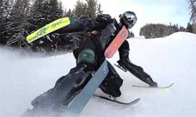 Le français Jean-Yves Blondeau (45 ans) a décliné la combinaison à roulettes qu'il avait inventée en 1995 pour les pentes enneigées. Sur sa combinaison se trouve neufs skis accrocher sur son corps, pour dévaler les pente...