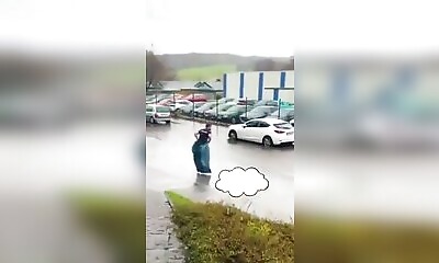 Un homme tente de traverser une route inondée pour rejoindre sa voiture en utilisant un sac plastique. La vidéo montre sa tentative pour éviter de se mouiller pendant qu'il avance dans l'eau et on se demande s'il parvien...