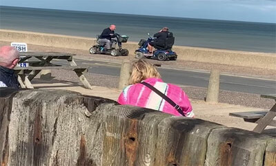 A Brighton en Angleterre, une femme filme avec son téléphone portable, deux hommes se bagarrer avec des scooters électriques pour personne à mobilité réduite. On peut voir sur la vidéo filmée à la verticale, les deux con...