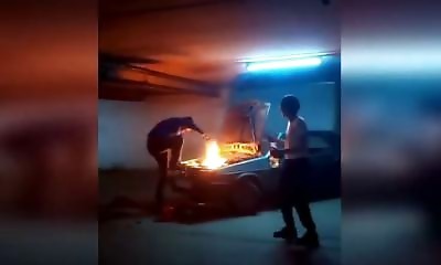 En Russie, à Tolyatti, un homme tente d’éteindre le moteur en feu de sa voiture après une petite séance de bricolage qui a mal tourné. D’abord, il essaie la méthode classique : étouffer les flammes avec un chiffon. Mauva...