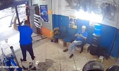 Dans ce qui semble être un garage, l'un des employés met en place une barre de fer (peut être pour soutenir la porte ?), sans faire attention à ce qu'elle ne tombe pas sur son collègue... 2 fois.