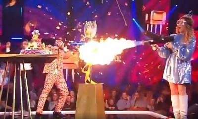 Maureen Vanherberghen, une présentatrice belge, doit utiliser un lance-flamme pour faire le show lors d'une émission de télévision, mais se trompe de sens et y laisse quelques poils... Après le lance-flamme, des lances-r...