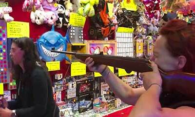 Dans cette vidéo vielle mais toujours aussi bien, une femme s'arrête à un stand de tir dans une fête foraine pour tirer avec une carabine à air comprimé, mais elle tire trop promptement et envoie un plomb au visage d'une...