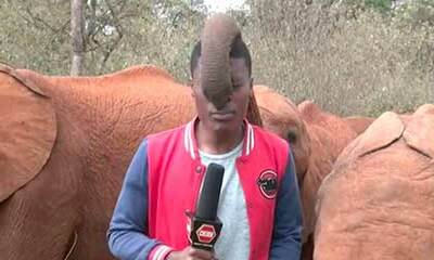 Alors qu'il effectue un reportage au refuge pour éléphants Sheldrick Elephant Nursery à Nairobi au Kenya, un journaliste se fait titiller la tête par la trompe d'un éléphanteau durant un direct sur la chaîne locale KBC. ...