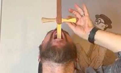 Un avaleur de sabre révèle son secret pour insérer la lame d'une épée dans sa bouche jusqu'à son estomac sans se mutiler. Au préalable, il ingère le fourreau de l'épée pour pouvoir ensuite y insérer la lame en toute sécu...