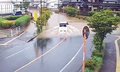 À Munakata, dans la préfecture de Fukuoka, une Nissan Serena s’engage sans précaution dans une portion de route inondée sur la 401. L’eau est trouble, impossible d’en voir la profondeur. Le véhicule s’arrête net et reste...