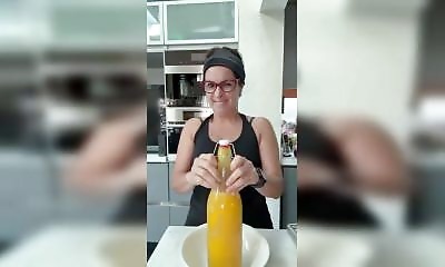 Une bouteille de jus de fruits avec pulpe a été laissée un moment au repos. Les sucres présents, combinés à des levures ou bactéries naturelles, ont produit de l’alcool et surtout du gaz carbonique. A peine cette femme t...