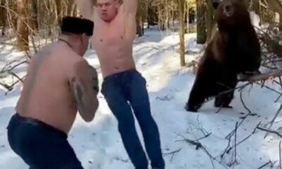 Une vidéo complètement WTF qui nous vient de Russie ou deux hommes sont filmés alors qu’ils s’entraînent torses nus à l’extérieur en plein hiver avec un ours qui secoue une branche pour faire bouger un des gars qui sert ...