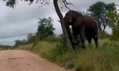 Alors que l'on parle de déforestation à travers le monde, les éléphants serait aussi coupable de cette catastrophe écologique. Dans cette vidéo, un homme au volant d’une jeep filme un éléphant qui déracine un arbre au bo...