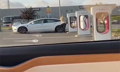 Dans une station de recharge électrique Tesla, une femme fait le plein de sa voiture électrique Tesla Model 3 à une borne. En effet, elle reste debout en tenant le connecteur du chargeur branché à son véhicule. Après un...