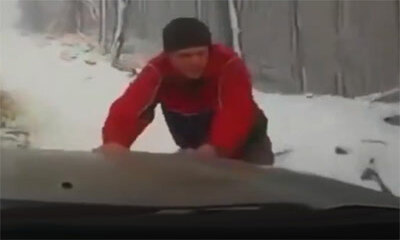 La boulette ! Arrête sur une route de montagne à cause d’un véhicule bloqué, le conducteur descend de son véhicule pour venir voir ce qu’il se passe. Mais monsieur oublie de serrer son frein à mains et sa voiture va comm...
