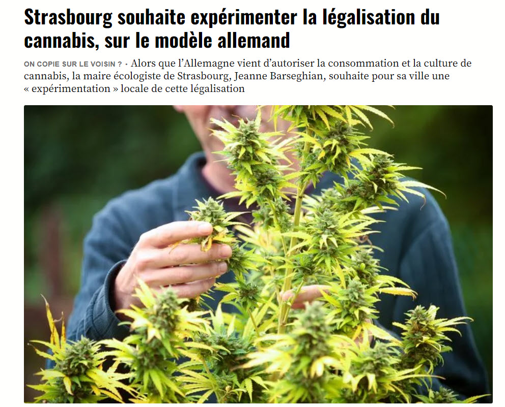L'Allemagne légalise à partir de lundi la consommation récréative du cannabis. La maire écologique de Strasbourg, ville frontalière, qui va se retrouver entre deux législations, plaide pour une expérimentation, ce qui n'est pas la ligne soutenue par l'exécutif.