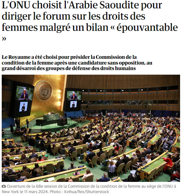 Énorme farce ? L'Arabie Saoudite a été désignée pour présider la Commission de la condition de la femme des Nations Unies, un organe dédié à la promotion de l'égalité des genres et à l'autonomisation des femmes. Cette décision a suscité la consternation des groupes de droits humains, étant donné le bilan jugé déplorable du royaume en matière de droits des femmes. Le représentant saoudien auprès de l'ONU, Abdulaziz Alwasil, a été élu à l'unanimité, en l'absence de candidats concurrents et sans objection lors de la réunion annuelle de la commission à New York.