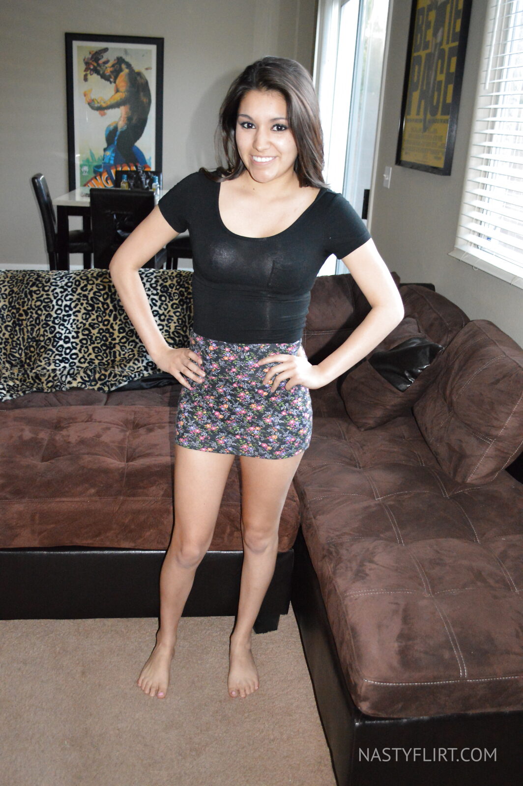 Découvrez une jeune femme brune portant une jupe ultra courte qui laisse entrevoir ses fesses et son string. Après avoir retiré sa jupe, elle écarte son string pour vous offrir une vue excitante de son intimité.