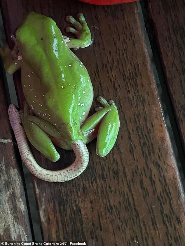 Une photo incroyable d'une grenouille verte en train d'accoucher d'un bébé serpent a été partagée sur la page Facebook de Sunshine Coast Snake Catchers. L'image montre un serpent brun de l'Est sortant du postérieur de la grenouille, complètement intact.Finn Richardson, de Sunshine Coast Snake Catchers, a déclaré que le serpent était mort à la sortie. Les internautes étaient perplexes et se sont interrogés sur les circonstances de cet événement étrange: Certains ont affirmé que les grenouilles vertes sont connues pour manger tout ce qui peut rentrer dans leur bouche, d'autres ont suggéré que la grenouille avait confondu le serpent avec un gros ver et l'avait mangé accidentellement. D'autres encore ont suggéré que la grenouille avait dépassé sa capacité de digestion en mangeant le serpent et qu'il avait été poussé hors de son corps presque intact.